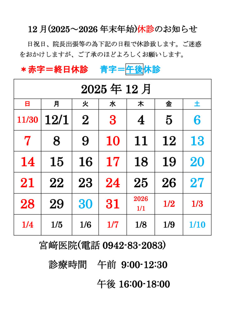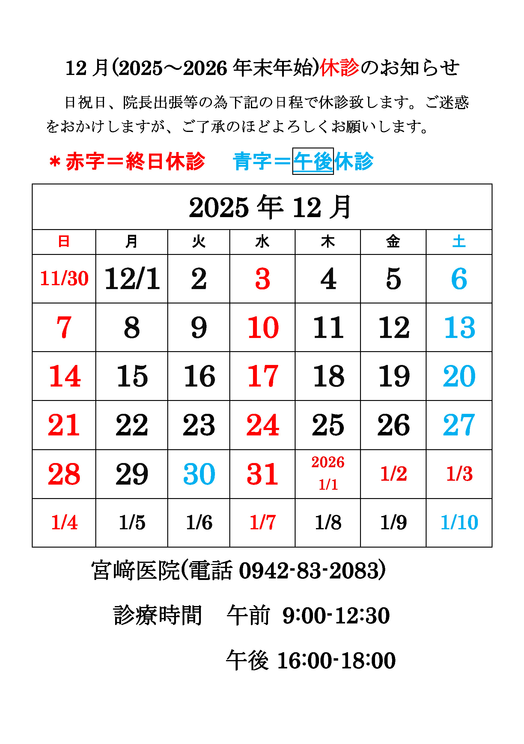 12月(年末年始)休診日のお知らせ 2025.11.27 医院からのお知らせ 毎週水曜日、日祝日は休診します。 また、12月30日は午後休診、31日〜2026年1月4日まで休診となります。 記事のタイトルとURLをコピーする インフルエンザワクチン料金について 前の記事