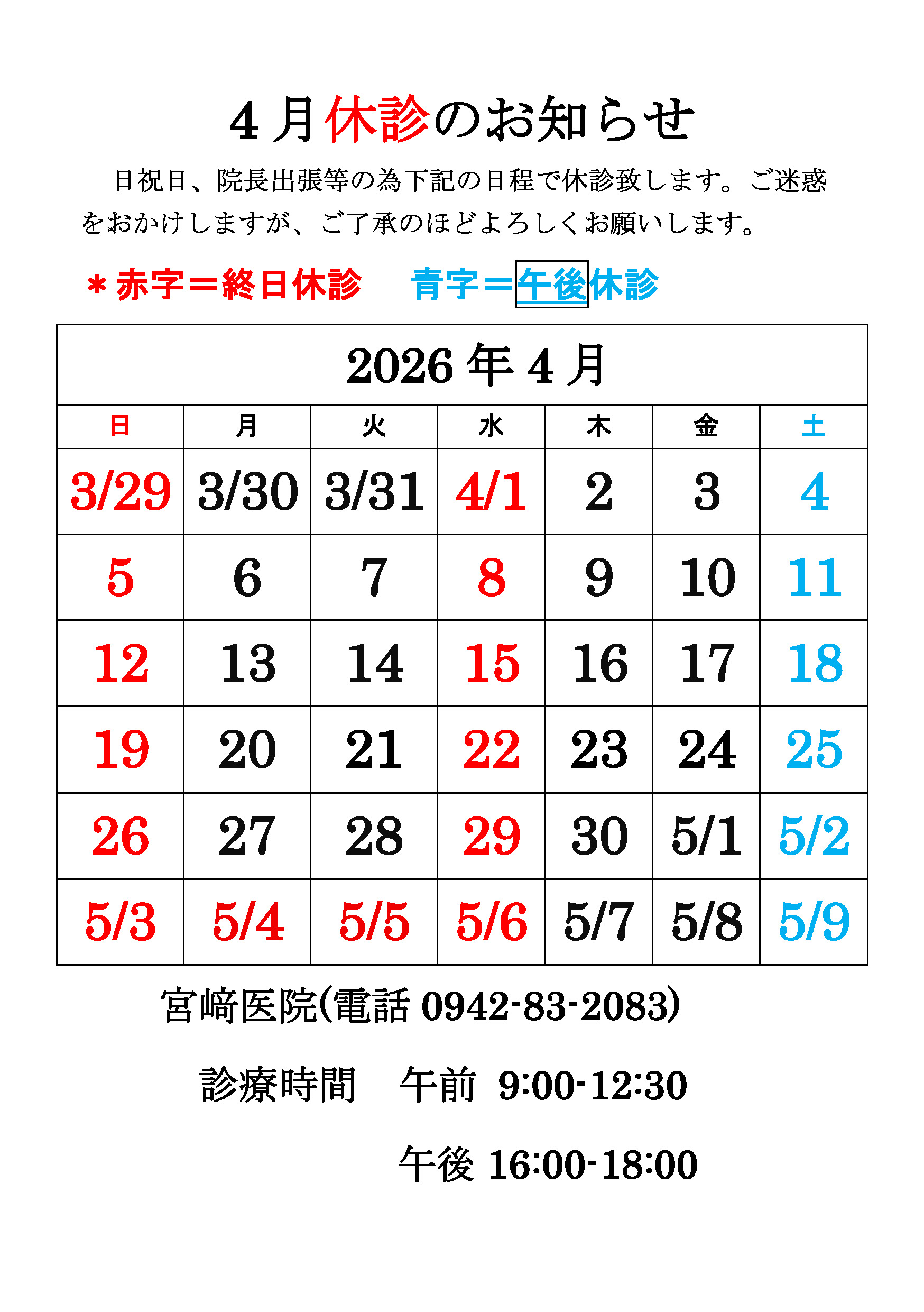 4月休診日のお知らせ 2026.03.27 医院からのお知らせ 毎週水曜日、日祝日は休診します。 また、5月2日の午後から5月6日まで休診となります。 記事のタイトルとURLをコピーする 3月休診日のお知らせ 前の記事